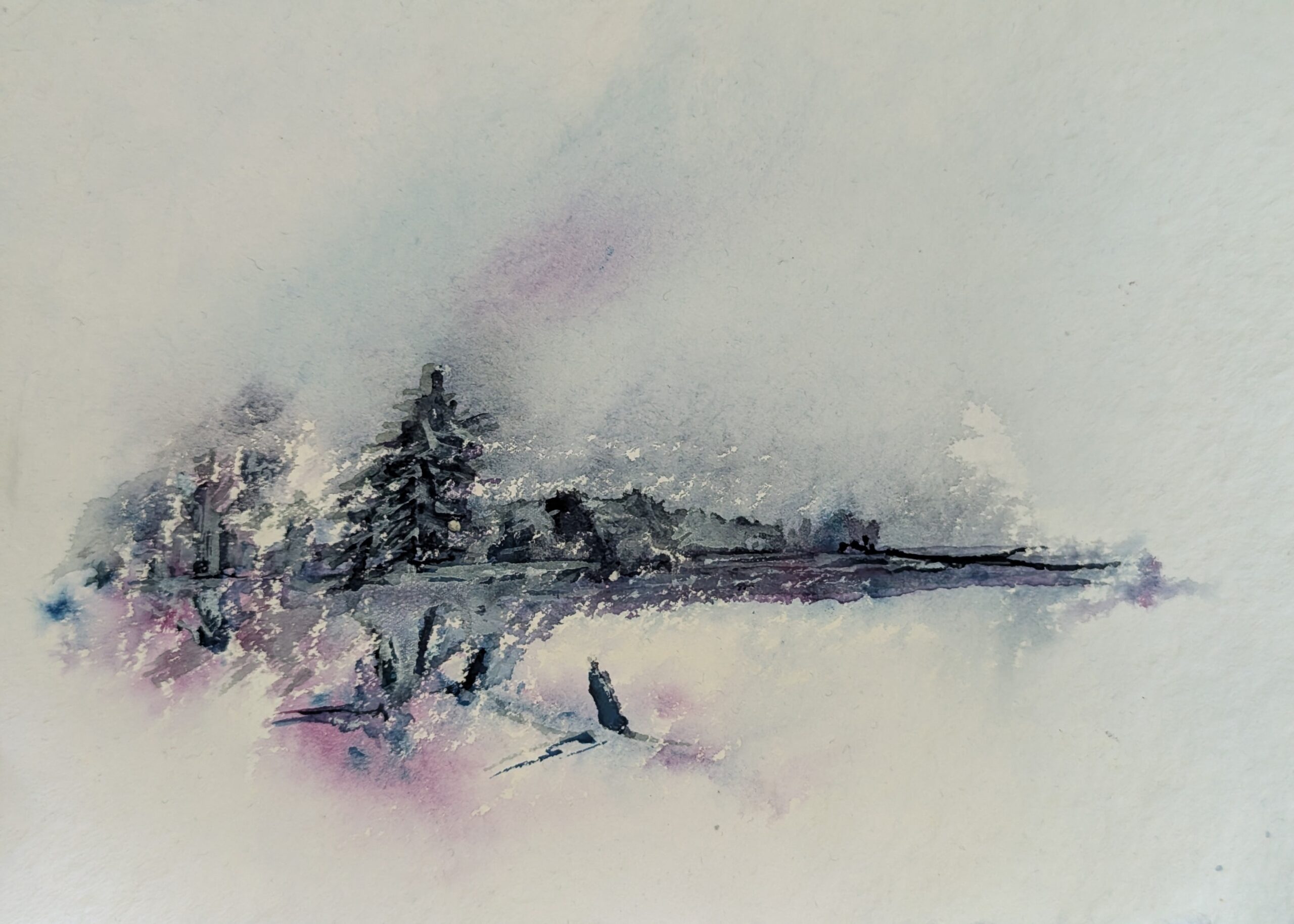 Painted on handmade cotton rag paper, a minimal pallette allows the snow to shine through